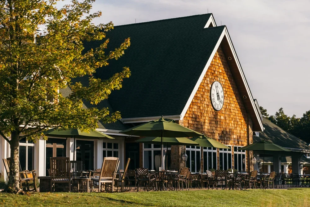 The grande clubhouse includes spacious dining rooms and bar, billiards room, outdoor occasional settings featuring expansive course views enjoyed by members and their guests on luxury golf destination trips.